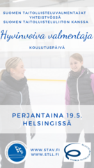 Suomen Taitoluisteluvalmentajat ry järjestää yhteistyössä Suomen Taitoluisteluliiton kanssa Hyvinvoiva valmentaja -päivän perjantaina 19.5. Helsingissä! Suomen Taitoluisteluvalmentajat ry järjestää yhteistyössä Suomen Taitoluisteluliiton kanssa Hyvinvoiva valmentaja -päivän perjantaina 19.5. Helsingissä! Päivän teemoina mm. haastavien vuorovaikutustilanteiden käsittely valmentajan työssä sekä mahdollisuus kysyä huipputuomareilta arvioinnista ja säännöistä. Huippuvieraana Maurizio Margaglio, jäätanssipari Juulia Turkkilan ja Matthias Versluis henkilökohtainen valmentaja. Lisätiedot ja ilmoittautuminen